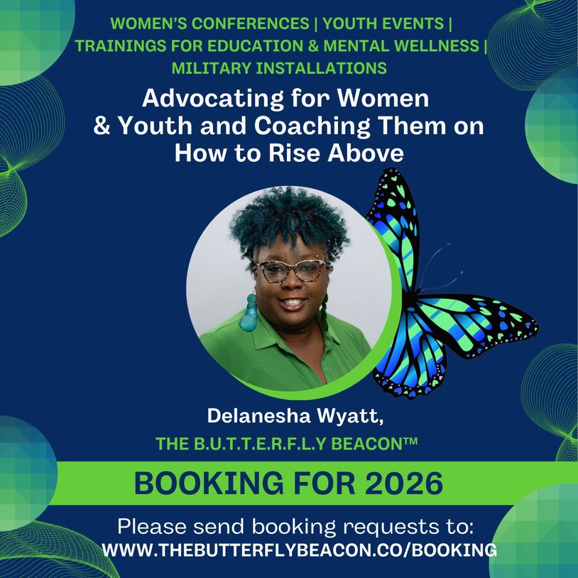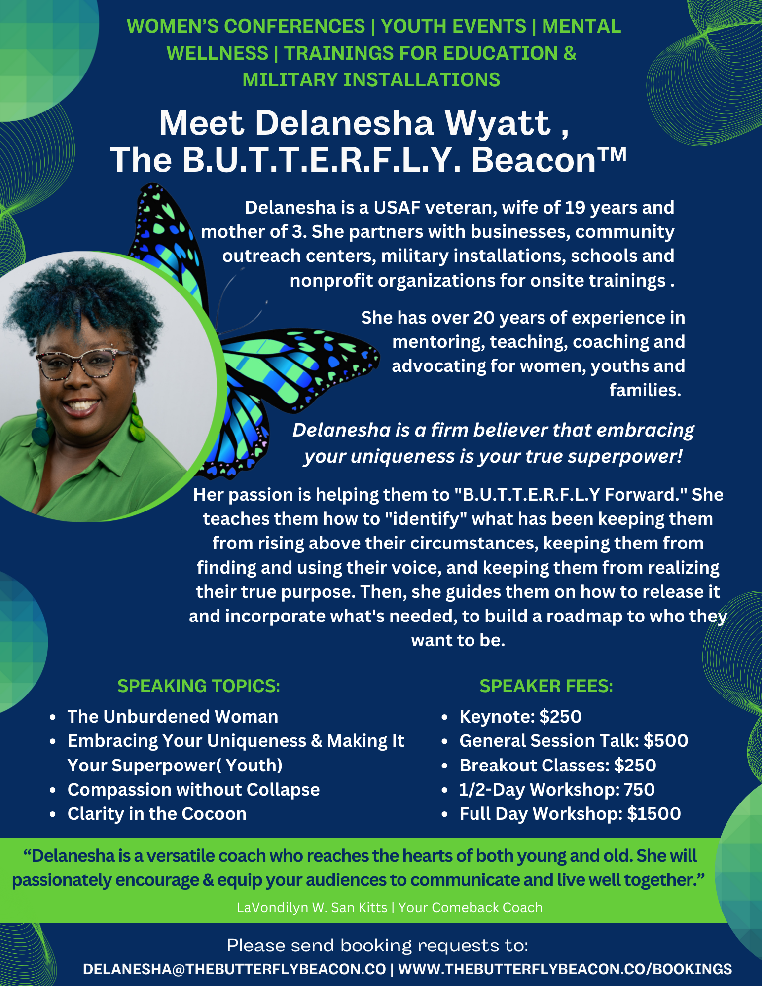 Delanesha is committed to guiding women and our youth to rise above their circumstances and start becoming who God created them to be. To book Delanesha Wyatt, The B.U.T.T.E.R.F.L.Y BEACON™, download her 1-Sheeter below.